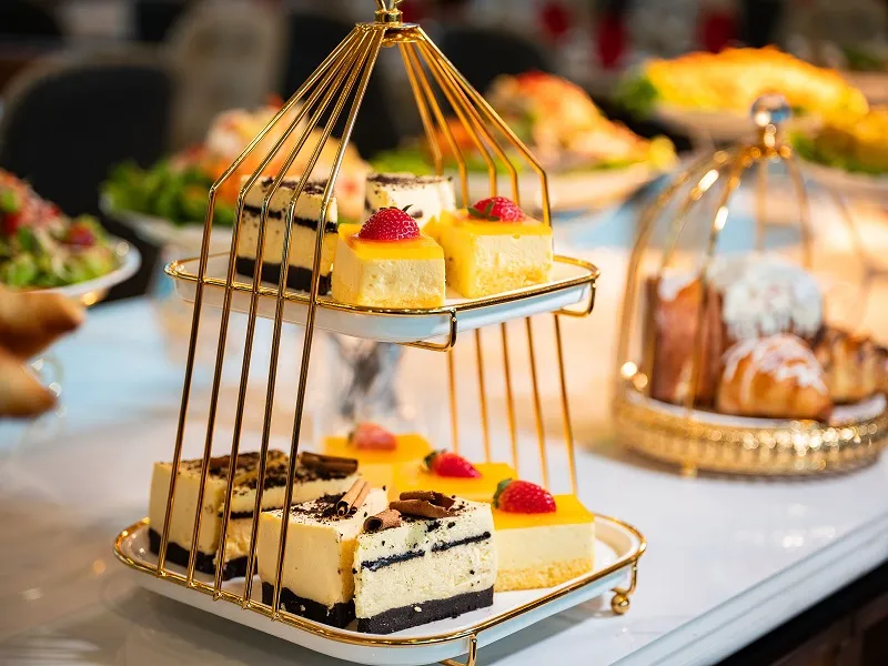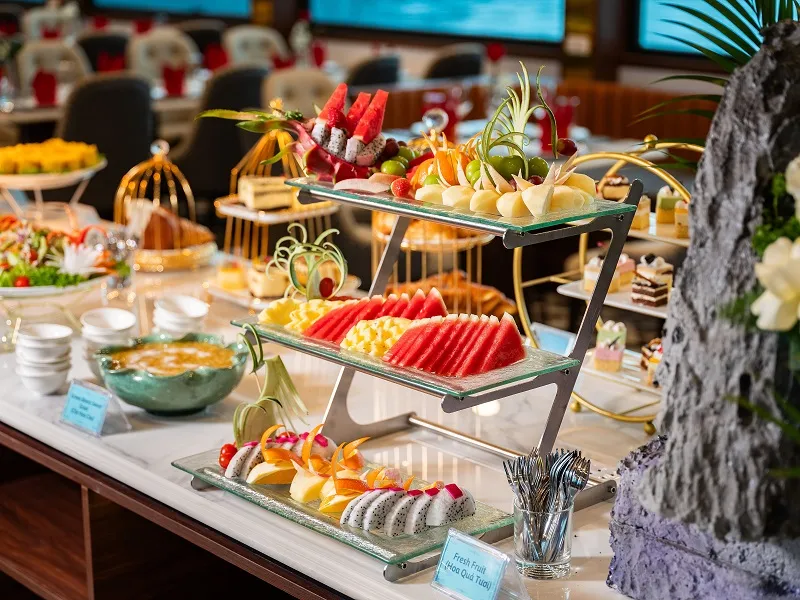 Du thuyền Ambrose Cruise mang đến trải nghiệm ẩm thực đẳng cấp với bữa trưa buffet phong phú, bao gồm các món ăn đặc sắc và tươi ngon. Du thuyền có khả năng phục vụ các yêu cầu đặc biệt về chế độ ăn uống như món chay, thuần chay và Halal, đảm bảo đáp ứng đa dạng nhu cầu ẩm thực của du khách.