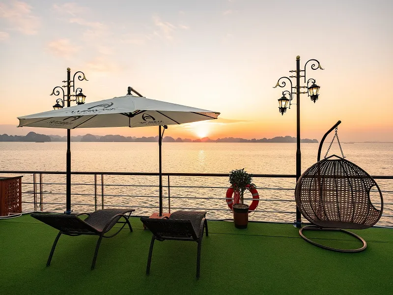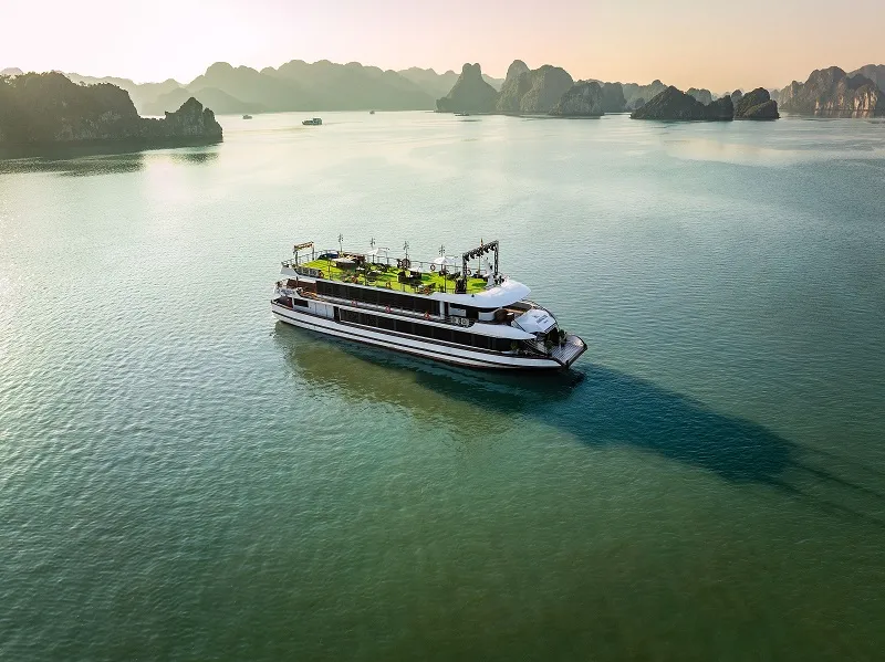 Du thuyền mang phong cách Đại Đông Dương – sang trọng đầy quý phái., gồm 3 tầng. chiều dài của tàu là 40m, sức chứa lên đến 99 khách. Cùng vô vàn tiện ích như: không gian tổ chức sự kiện, sân khấu hoành tráng, màn hình led lớn, nhà hàng ocean view kết hợp cùng quầy bar. Không gian ngoài trời sẽ có những ghế nằm dài trên boong tàu. Đặc biệt nhất là bể bơi vô cực ở vị trí tầng 2, bạn có thể đắm mình trông bể bơi vô cực, tận hưởng và thư giãn, ngắm nhìn vẻ đẹp của vịnh Hạ Long.