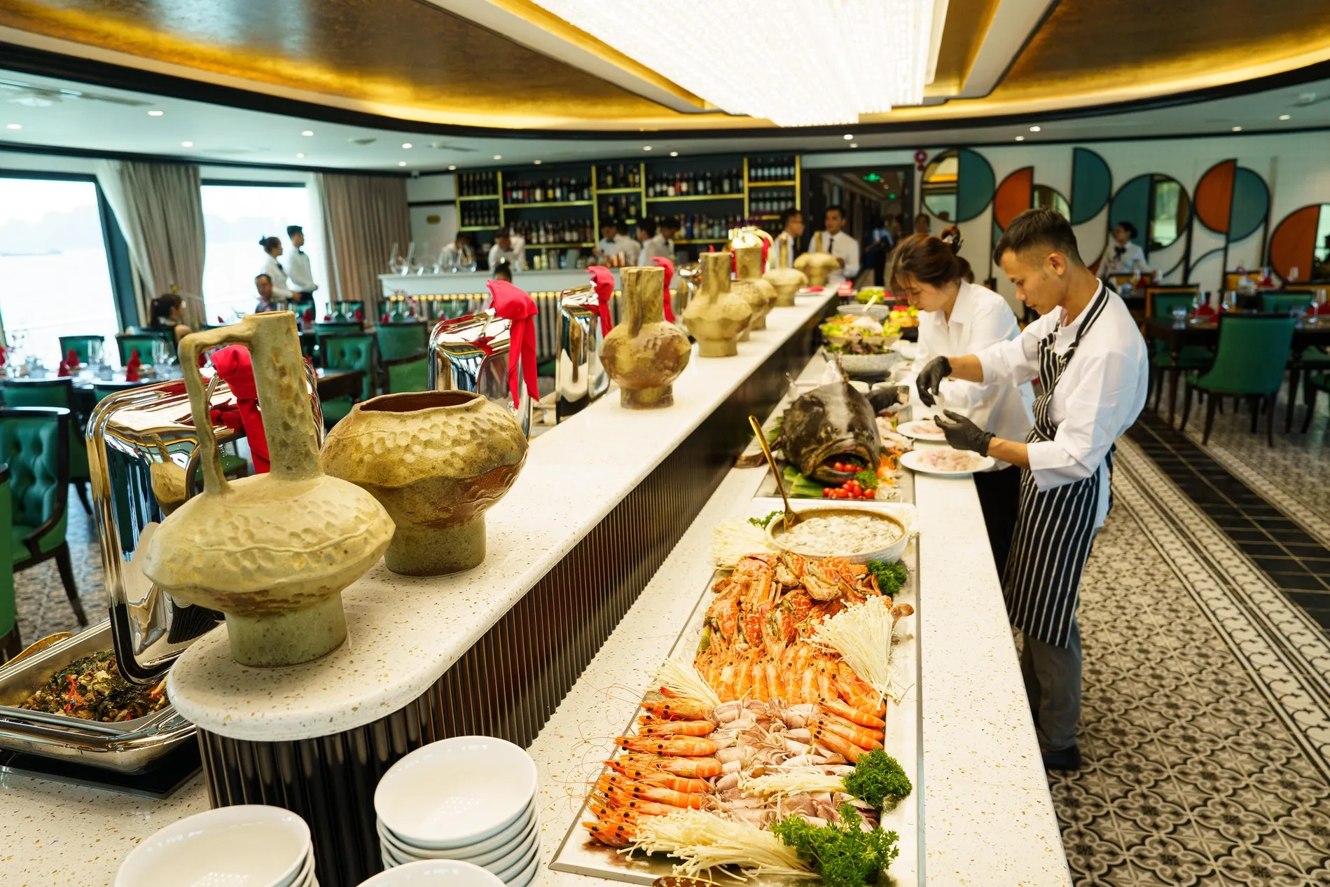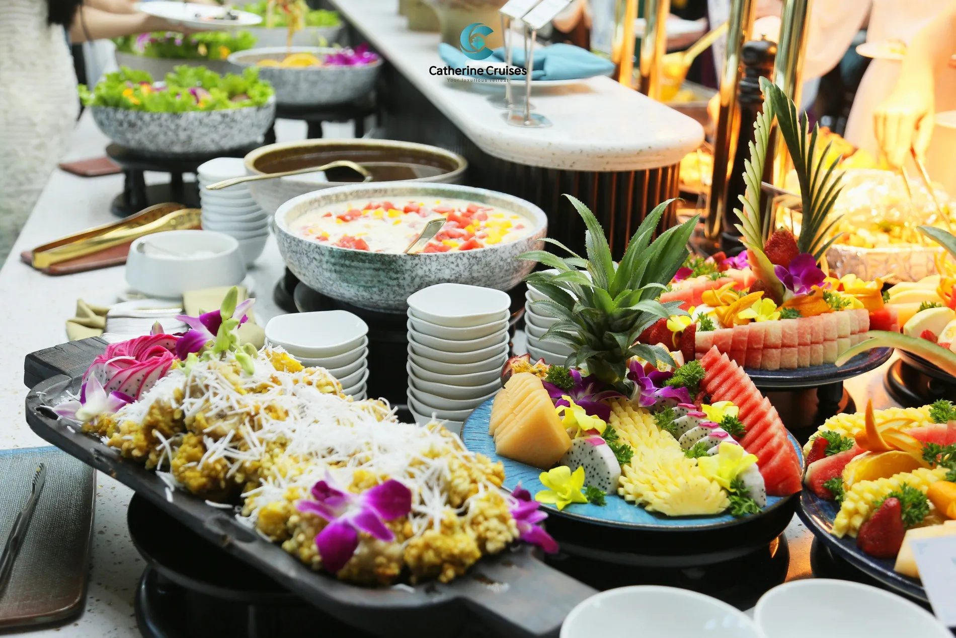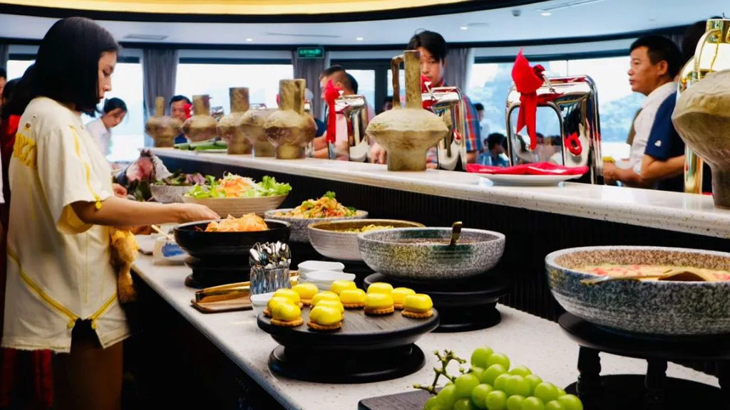 12:45 Thưởng thức bữa trưa tại nhà hàng sang trọng với những món ăn được chế biến hấp dẫn bởi các đầu bếp chuyên nghiệp của Catherine. Trong lúc đó tàu di chuyển đưa Quý khách ngắm nhìn cảnh quan đặc sắc, tạo bởi vô vàn đảo đá vôi xứng danh Di sản thiên nhiên thế giới.