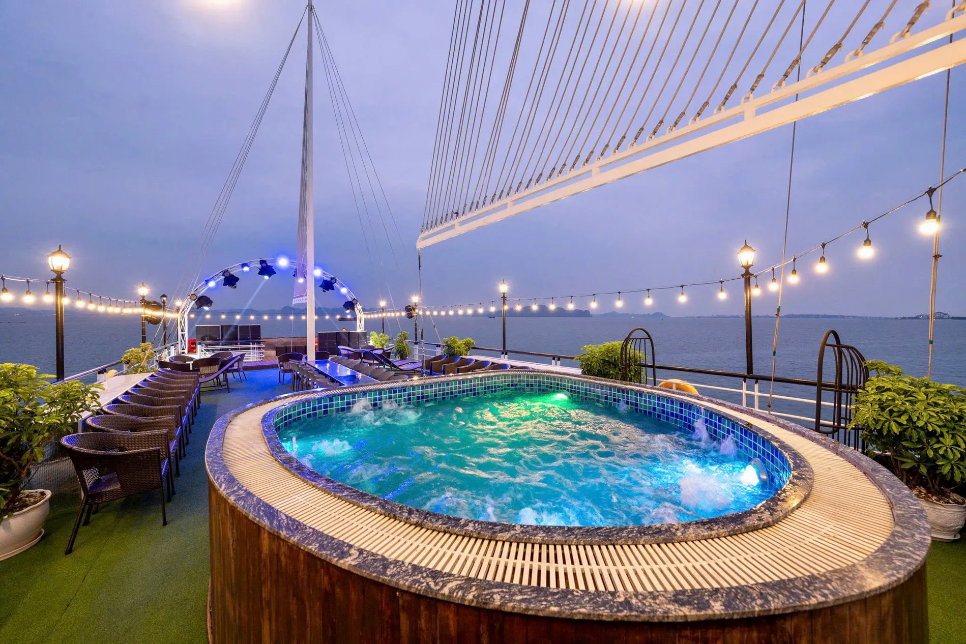 Thư giãn trên boong tắm nắng : Thư giãn trên boong tắm nắng và đắm mình vào khung cảnh ngoạn mục, đặc biệt là khi mặt trời lặn, tạo nên khoảnh khắc kỳ diệu đáng nhớ.
