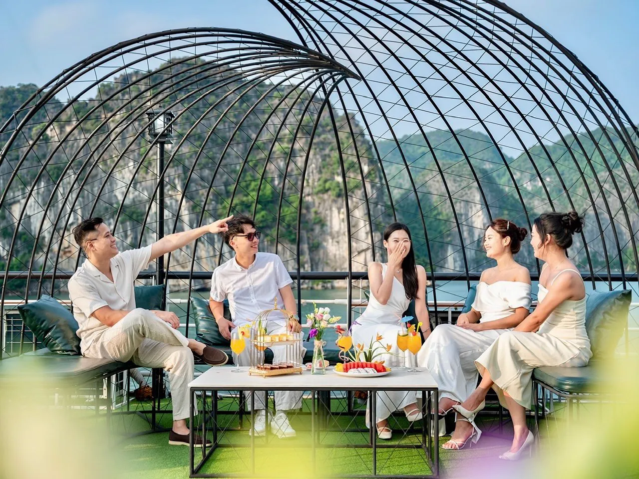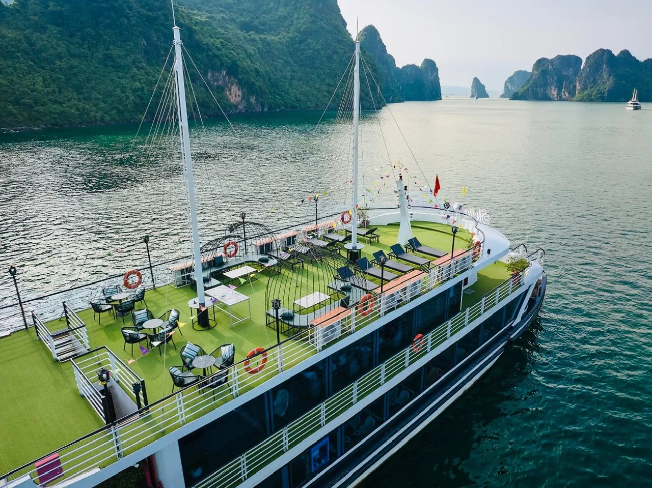 Qúy khách có thể vui đùa trên bãi tắm, bơi lội, đi bộ lên đỉnh Ti top chụp những bức ảnh đẹp với thiên nhiên: biển, trời, núi đá vôi.. hoặc ở lại trên thuyền thư giãn trong bể sục Jacuzzi, tận hưởng vẻ đẹp tuyệt vời của vịnh Hạ Long.