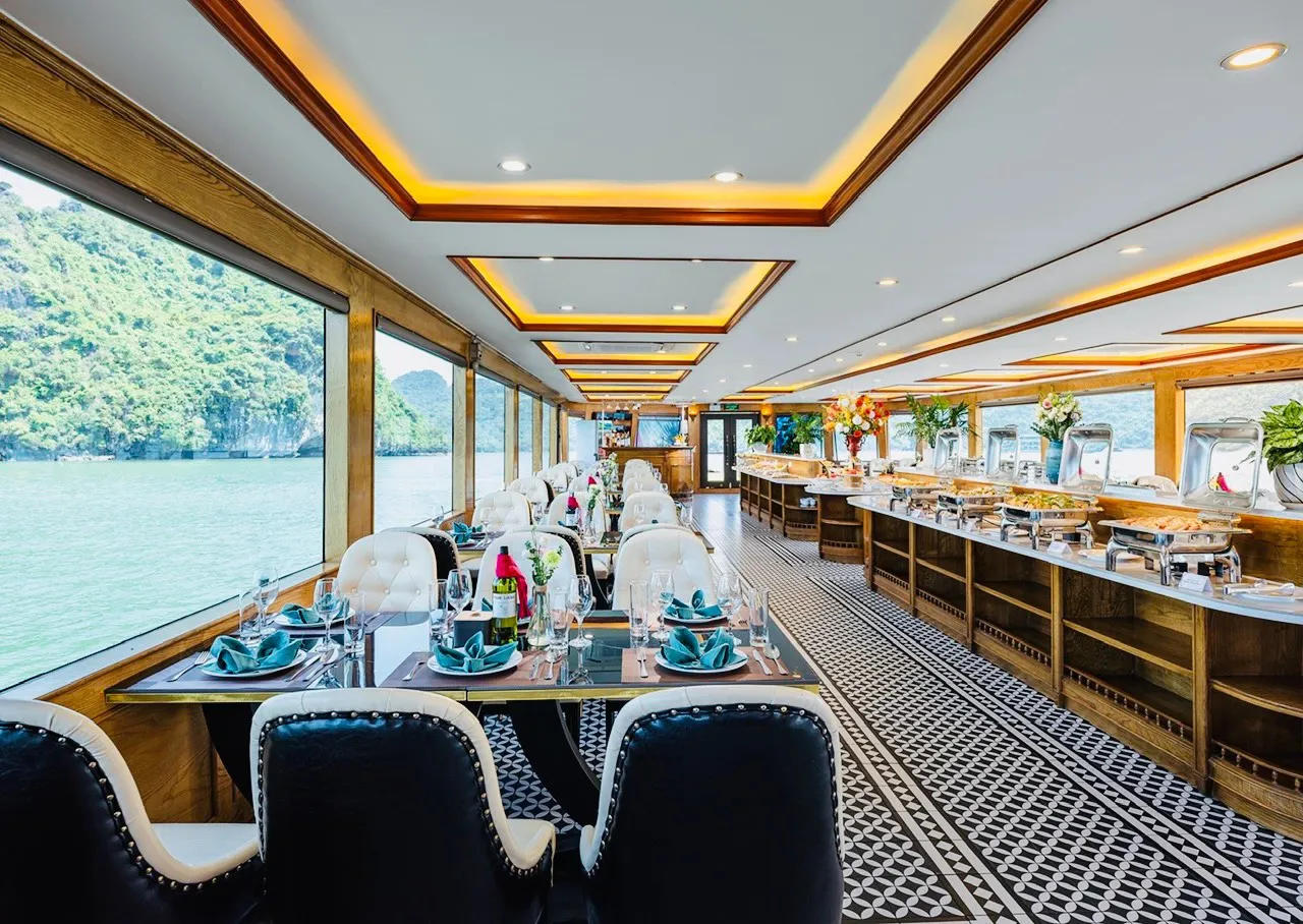 Quý khách thưởng thức bữa trưa buffet tại nhà hàng sang trọng với những món ăn hải sản đặc sắc của vùng biển Hạ Long. Du thuyền bắt đầu khởi hành và di chuyển qua những điểm nổi tiếng