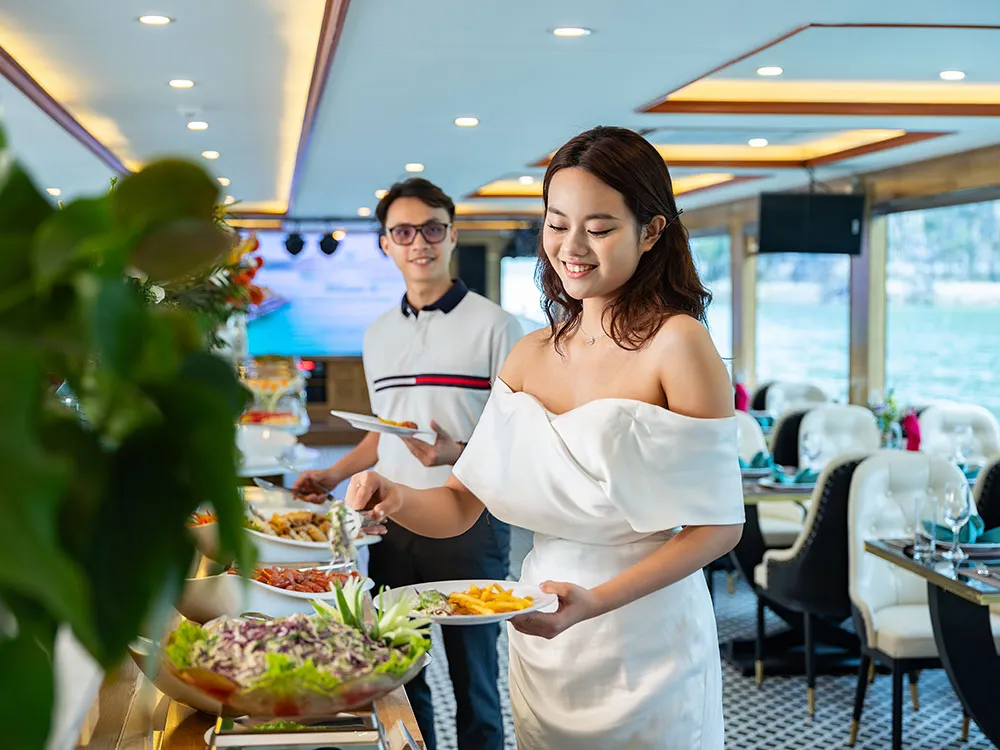 12h00 – 13h15. Dùng bữa trưa trên du thuyền