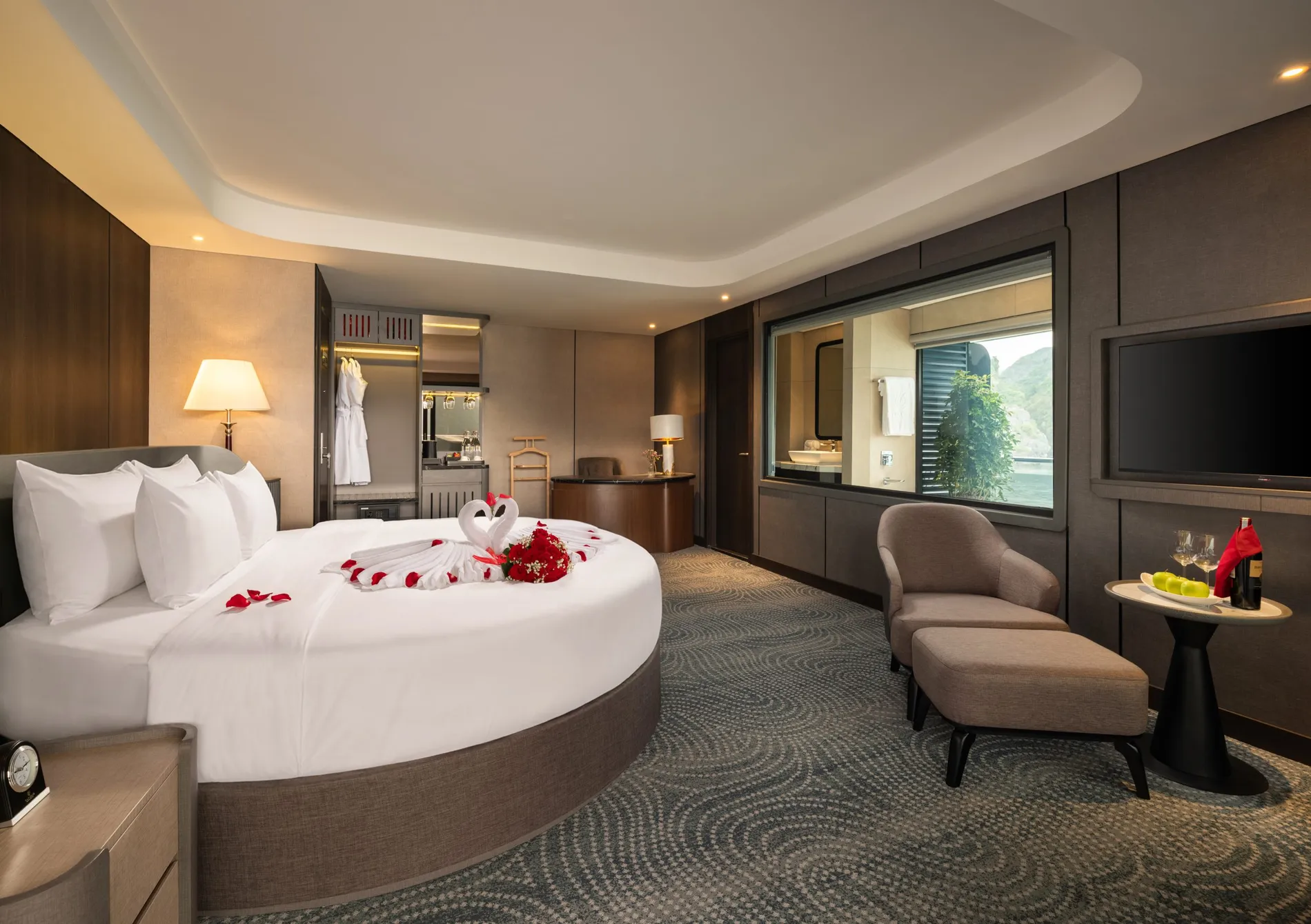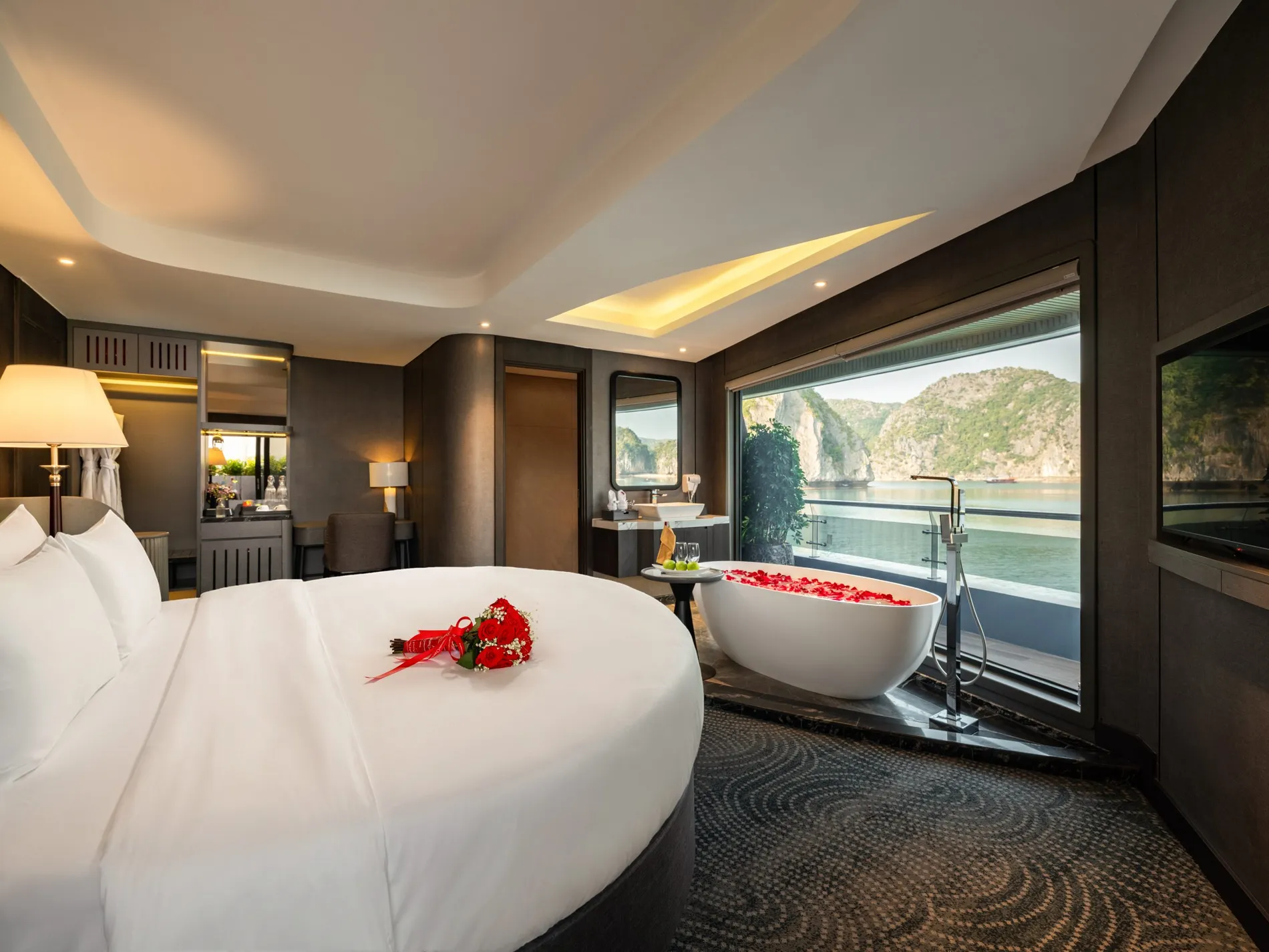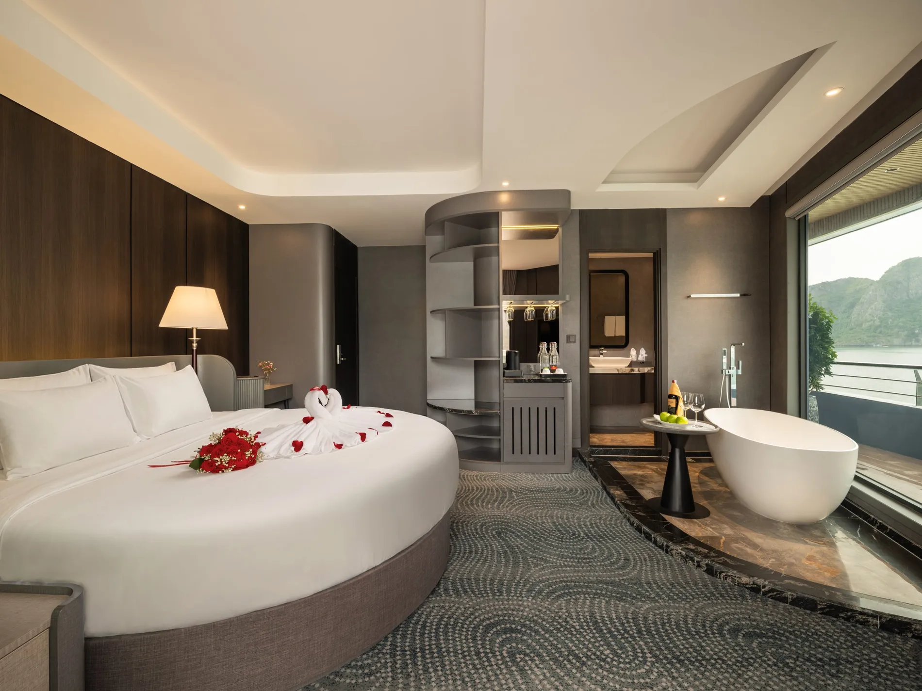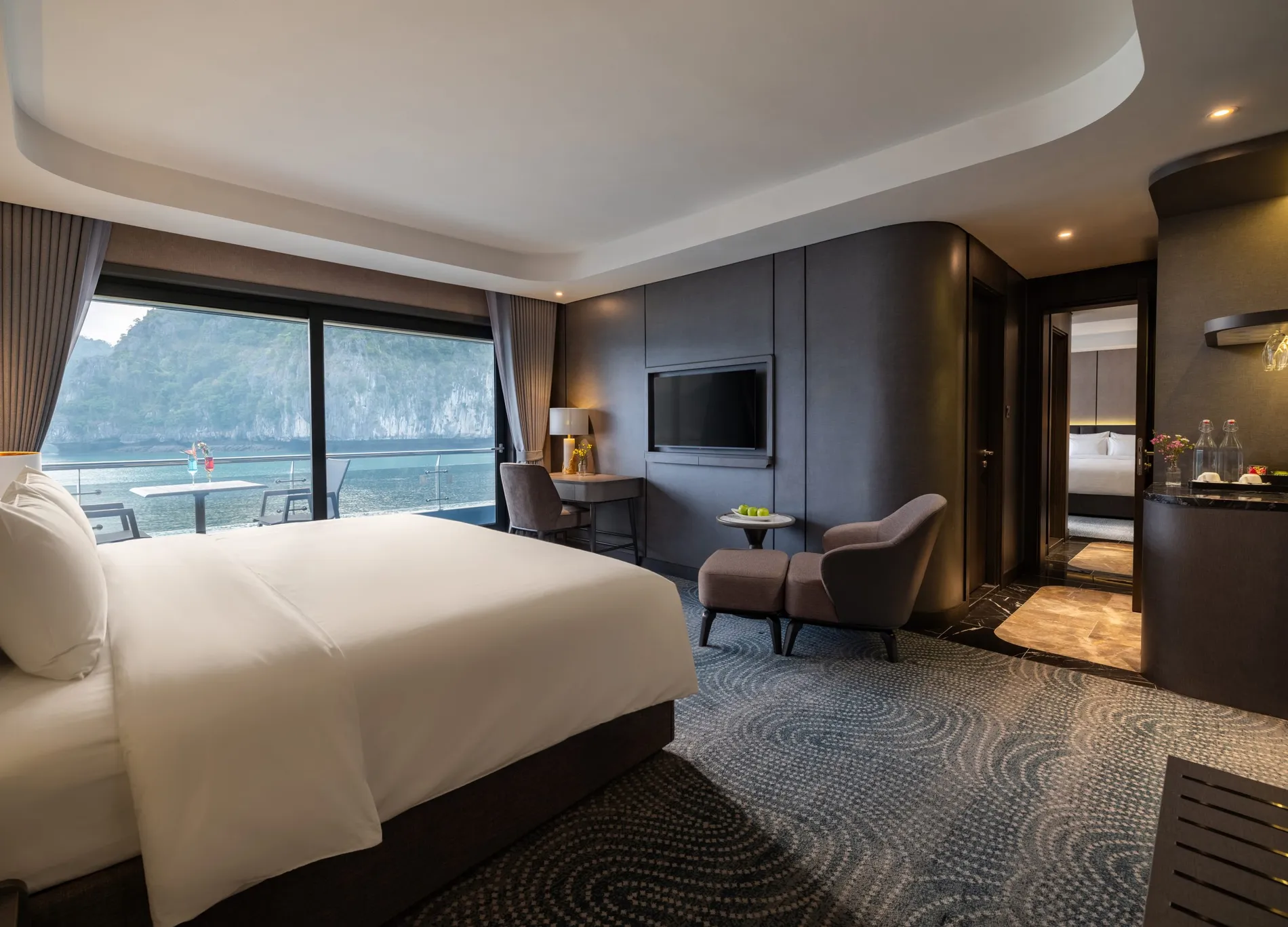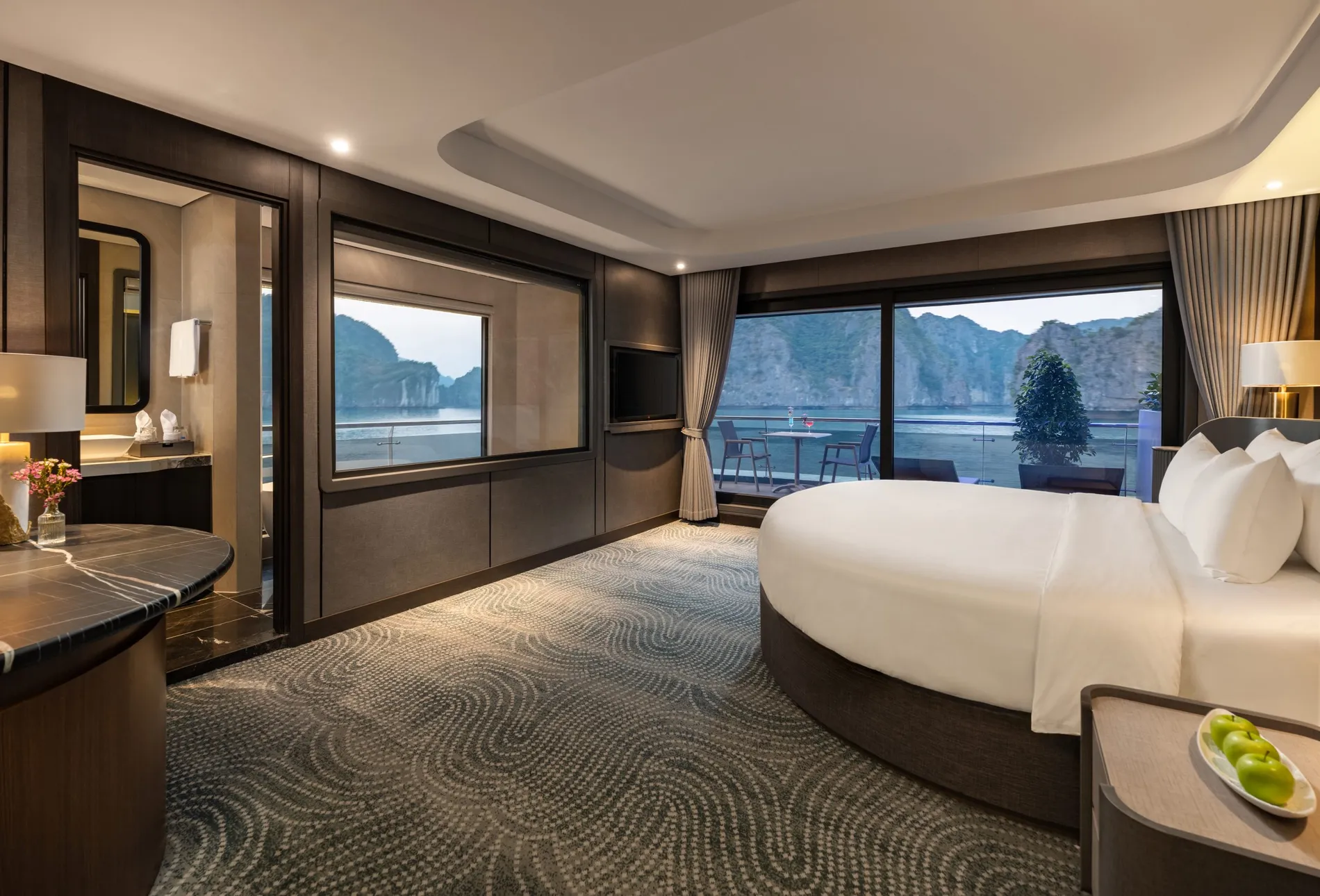 Điểm nổi bật: Phòng ngủ và phòng tắm rộng rãi với cửa sổ lớn mở ra tầm nhìn bao quát Vịnh Lan Hạ, trong khi ban công riêng với chỗ ngồi mời gọi du khách thưởng thức một tách trà, hít thở làn gió biển và đắm mình trong vẻ đẹp thanh bình của vịnh.