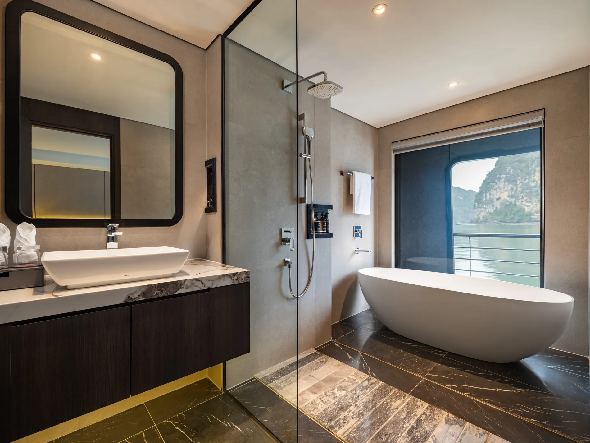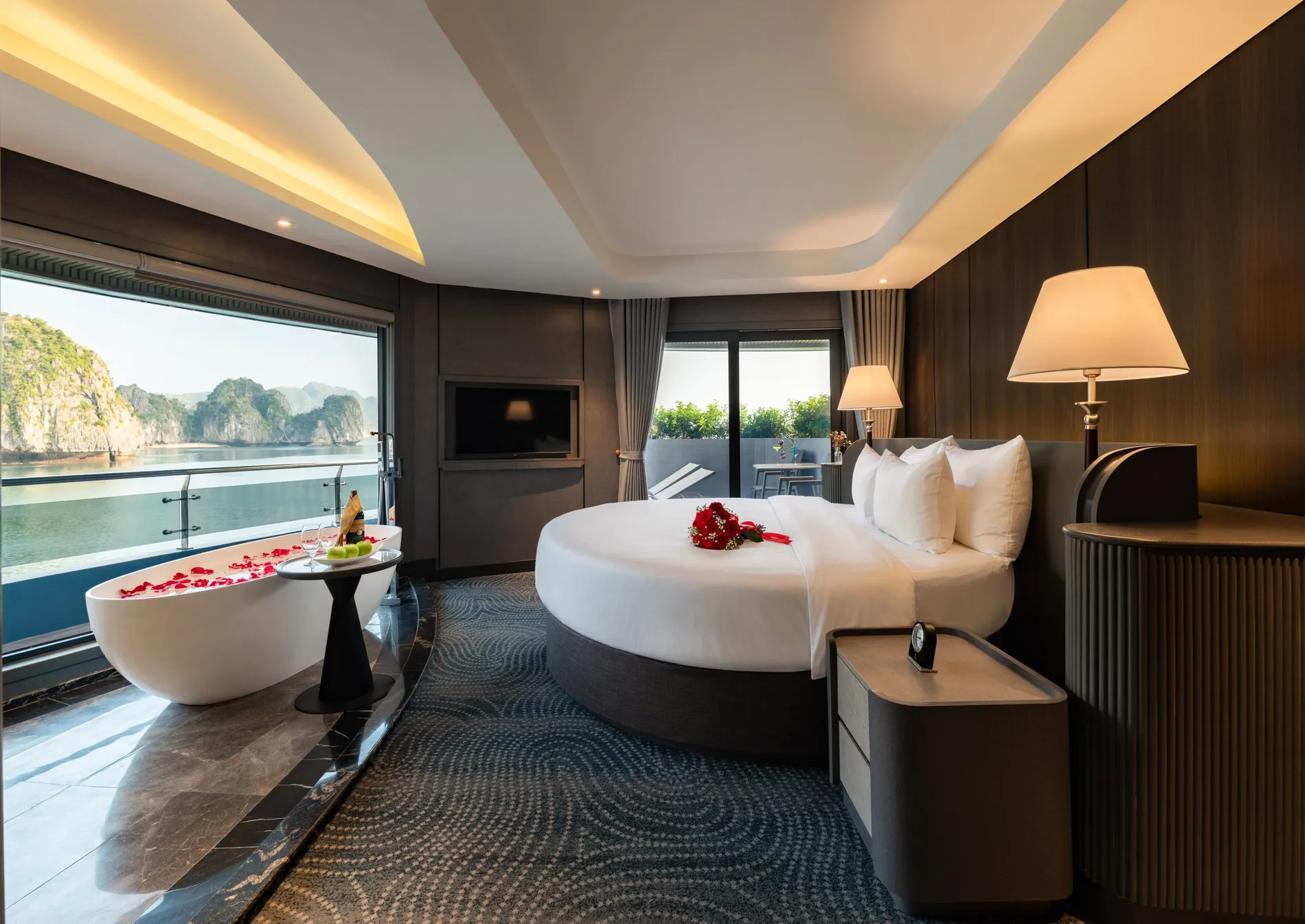 - Các cabin sang trọng với máy lạnh, ban công riêng, cửa sổ nhìn ra biển, vòi sen và bồn tắm.