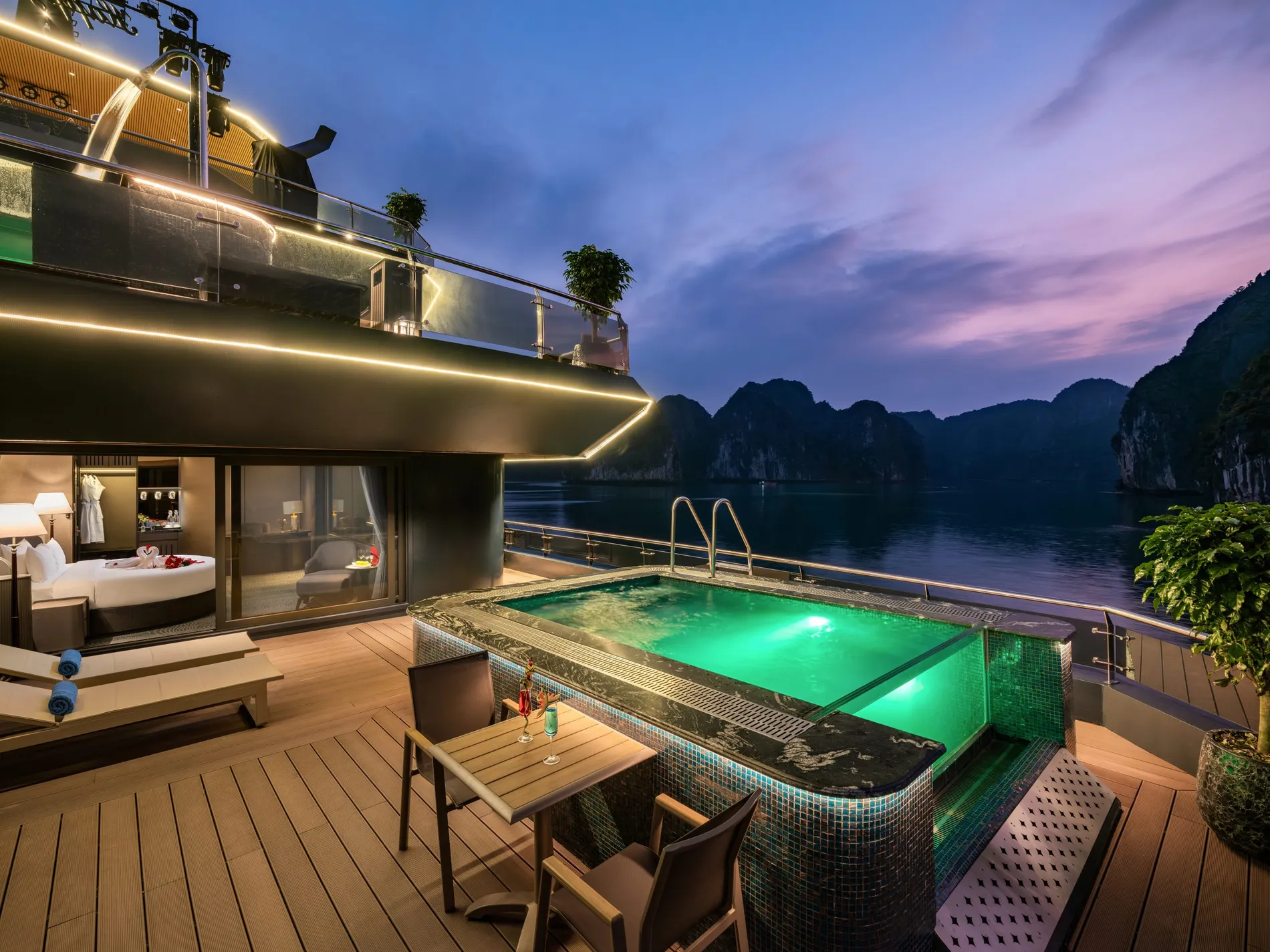 Điểm nổi bật: Phòng suite này có hồ bơi mini riêng (sâu 0,9m, dài 4,1m, rộng nhất 3m, dung tích khoảng 5,6m³) và khu vực tắm nắng riêng biệt. Được thiết kế độc đáo, phòng suite mang đến sự riêng tư tuyệt đối và vẻ sang trọng tinh tế, trở thành nơi nghỉ dưỡng lý tưởng dành cho những vị khách quý.